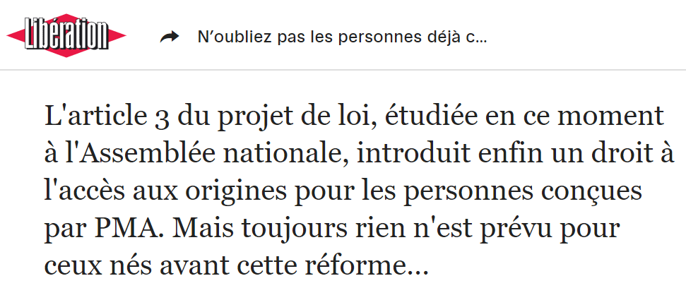 12 septembre 2019 : Publication d’une tribune cosignée avec l’association PMANONYME dans le journal Libération « N’oubliez pas les personnes déjà conçues par PMA avec tiers donneur » :