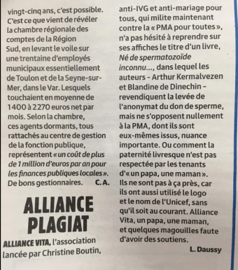 10 juillet : Publication d’une brève dans Charlie Hebdo dénonçant la récupération par Alliance Vita, contre l’avis et les opinions des auteurs du titre du livre «Né de spermatozoïde inconnu», dans le cadre d’une campagne contre la PMA pour toutes.